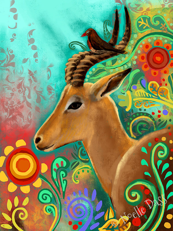 Gazelle and Bird Friends A. 11x14 in. archival paper with white border - image is 8x10
